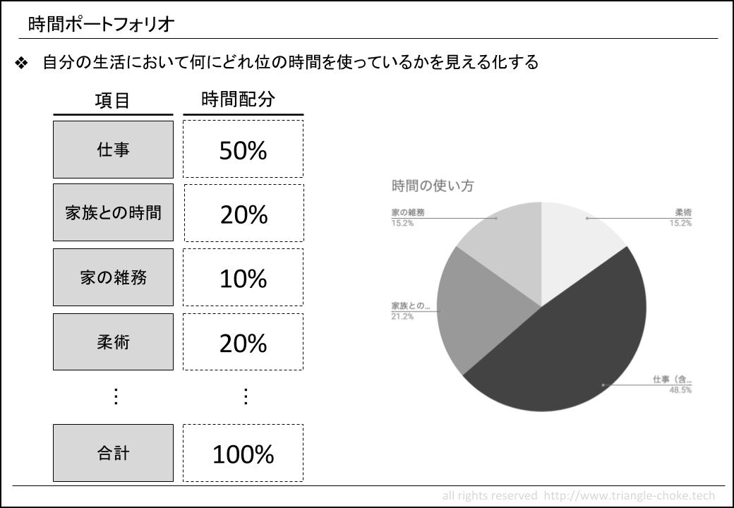 この時間を使っている項目とその配分比率を時間ポートフォリオと呼びましょう。