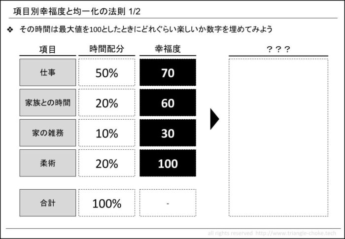 幸福度均一化の法則とは人生の幸福度は、時間配分している項目と幸福度の加重平均値に近づくというルールです。